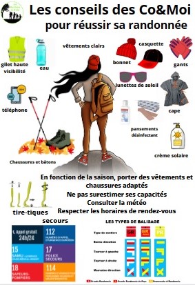 - Vêtements et chaussures adaptés à la randonnée et en fonction de la météo ( ex : cape de pluie, bonnet/gants, ou casquette...)